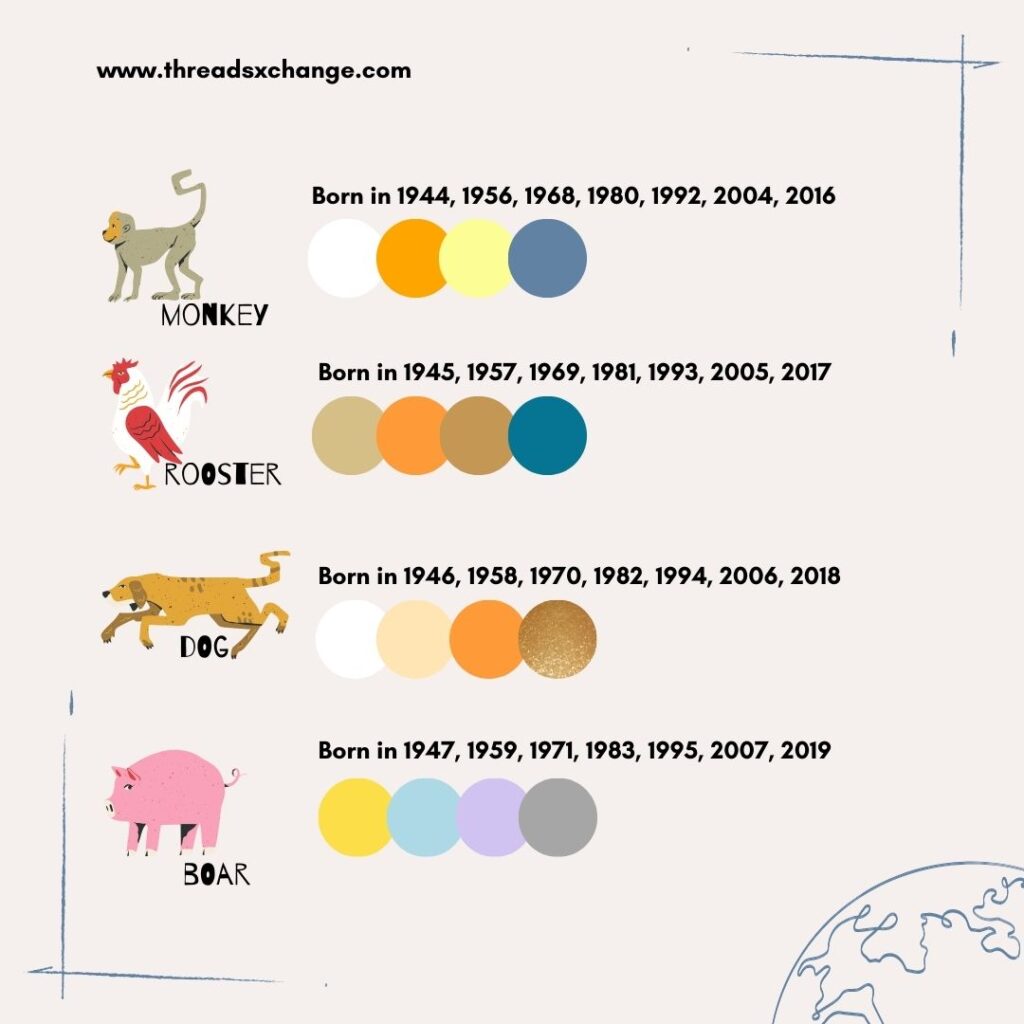 | Monkey | 1944, 1956, 1968, 1980, 1992, 2004, 2016 | White, Orange, Lemon, Blue |
